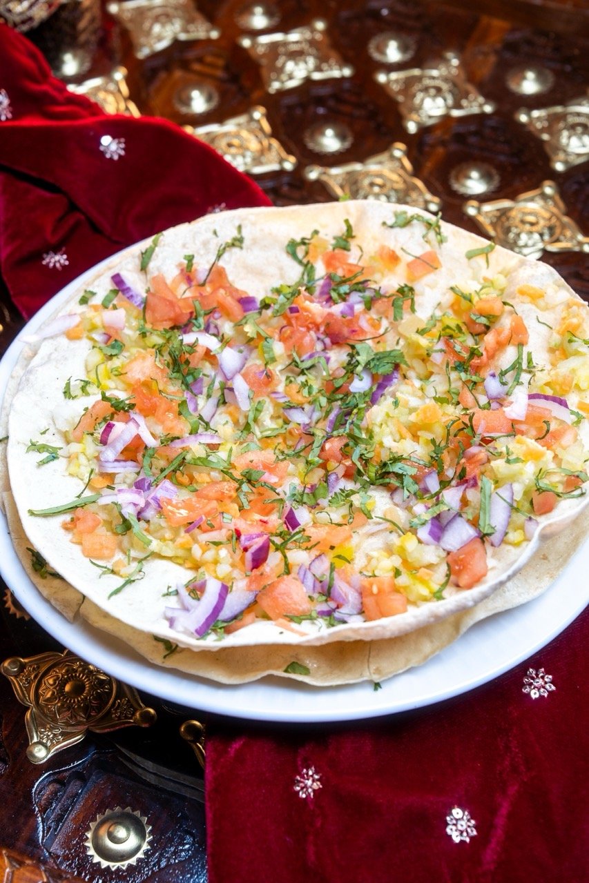 Sfoglia croccante a base di legumi guarnito con verdure crude